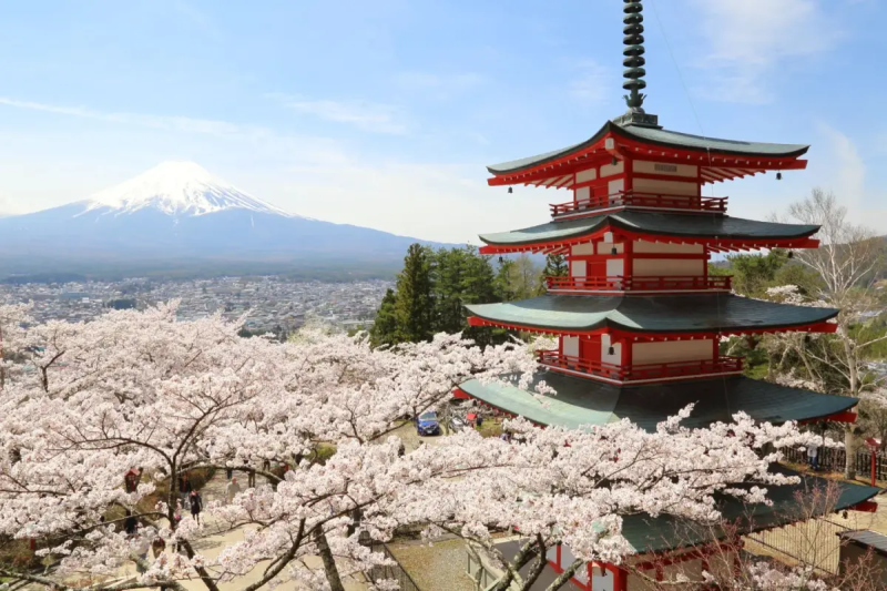 The Chureito Pagoda (忠霊塔, Chūreitō), a five-storied pagoda on the mountainside of Fujiyoshida City, offers breathtaking views of Mount Fuji. Built in 1963 as part of Arakura Sengen Shrine, it's reached by climbing nearly 400 steps from the shrine’s main buildings. The pagoda is especially stunning during cherry blossom season in mid-April, when hundreds of trees bloom, and in early November when autumn leaves paint the landscape in vibrant colors.