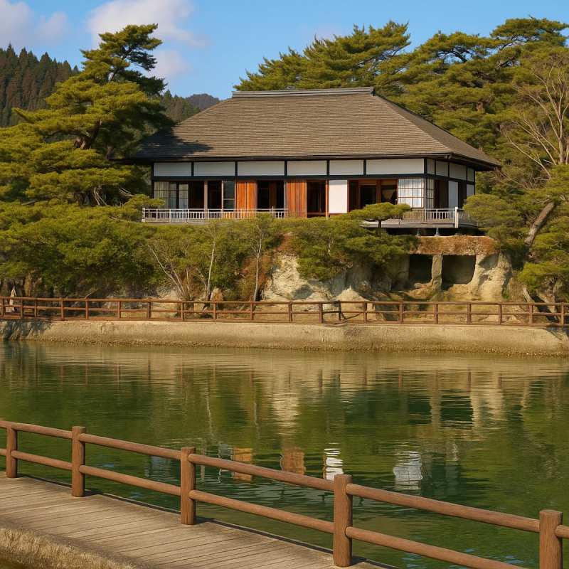 Kanrantei (観瀾亭), a stunning Momoyama-style teahouse, offers a serene view of Matsushima Bay. Its name, meaning “place to view ripples on water,” perfectly reflects the peaceful ambiance of the location, where visitors can enjoy sweeping vistas of the calm sea and the surrounding islands. Originally constructed in Kyoto by the renowned samurai lord Toyotomi Hideyoshi, the teahouse was later gifted to Date Masamune, a powerful feudal lord. Afterward, Masamune’s son relocated it to its present site in the tranquil surroundings of Matsushima, where it continues to stand as a symbol of both cultural and historical significance.
