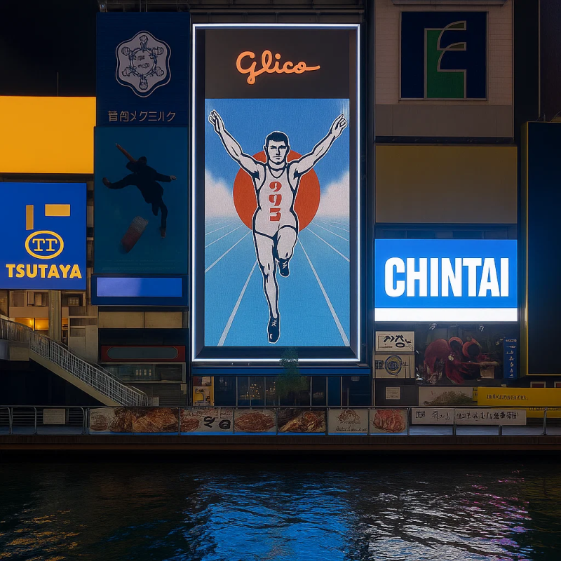 Glico Man (グリコサイン) is een iconisch symbool van Osaka, trots staand in het hart van Dotonbori. Deze neon-verlichte figuur, een beroemde reclame, trekt bezoekers van over de hele wereld aan. Het vertegenwoordigt het merk Glico en is een must-see voor toeristen die de levendige straten van Osaka verkennen. Het bord is synoniem geworden met het bruisende nachtleven en culinaire scene van Osaka.